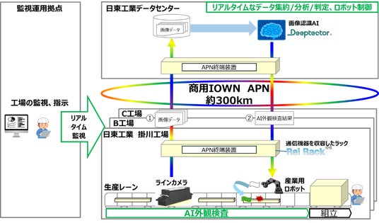 こうした中、日東工業、NTT西日本、NTTドコモビジネスは、「大容量・低遅延・ゆらぎゼロ」を特長とするIOWN APNを用いてデータセンターと工場を接続し、画像解析可能なAI基盤を工場外のデータセンターに集約する遠隔からのAI外観検査の有効性を検証しました。