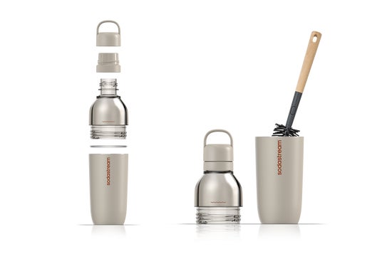 ソーダストリームの炭酸水メーカーに直接取り付けて炭酸を注入できるため、作った炭酸水をそのまま持ち運べます。透明なドーム部分に水位線を設け、水を入れる量が一目でわかる設計です。