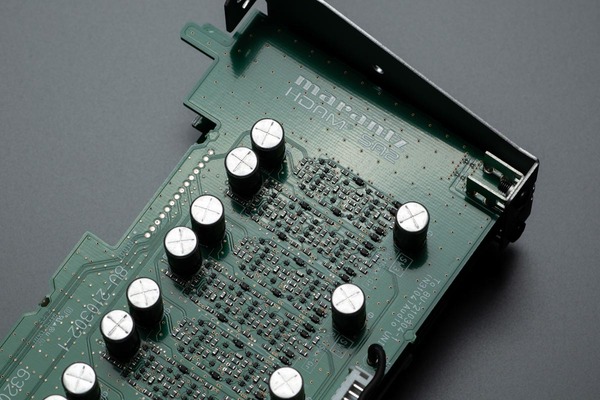 電流出力型は微細な信号の再現性に優れる反面、I/V(電流/電圧)変換回路を外付けで構成する必要があり、部品点数とコストが増大する。しかし、マランツはあえてこの方式を採用し、オペアンプや周辺パーツの選定、回路設計における自由度を確保、独自の音作りを徹底している。DAC基板上のアナログ信号ラインには、電流ノイズが発生しにくい薄膜抵抗などの高品位パーツが投入されている。