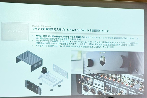 新プレミアムキャビネット&高剛性シャーシ: AV 10と同等のフロントパネルと、トランスの振動を抑制する複層構造のベースプレートを採用。