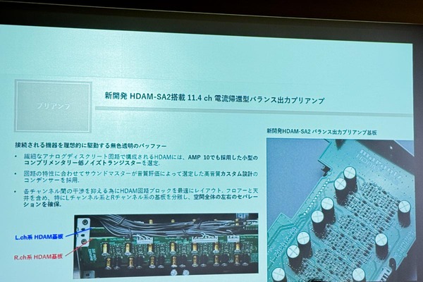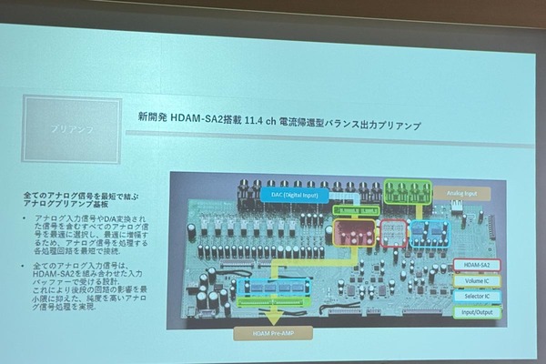 新開発HDAM-SA2搭載 11.4chプリアンプ:全チャンネルに独自の高速アンプモジュールHDAM-SA2を採用した電流帰還型回路。