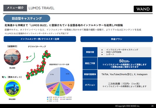 株式会社WAND(本社:東京都渋谷区、代表取締役社長:黒崎 悠一/以下、WAND)は、ショート動画マーケティング支援サービス「LUMOS」において、インフルエンサーを実店舗やイベント会場へ派遣し、体験型コンテンツを創出する「訪店・体験型キャスティング」の提供を本格開始いたしました。