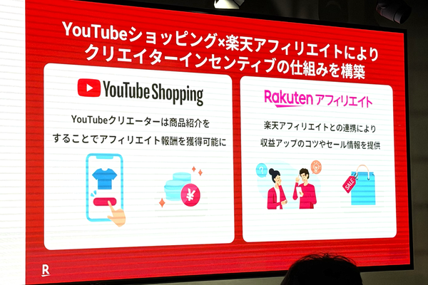 グーグル、楽天グループは2月19日、都内で記者発表会を開催し「YouTube ショッピング アフィリエイト プログラム」の日本導入と、楽天グループとのパートナーシップ締結を発表した。これにより、YouTubeの動画内で紹介された商品を、視聴者が動画を見ながらシームレスに楽天市場で購入できる仕組みが本格稼働する。