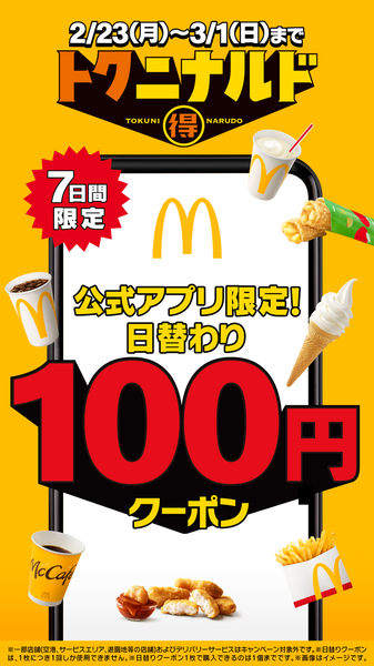 マクドナルドは、2月23日~3月1日の7日間、マクドナルド公式アプリにて人気の商品が100円になるクーポンを日替わりで配信します。