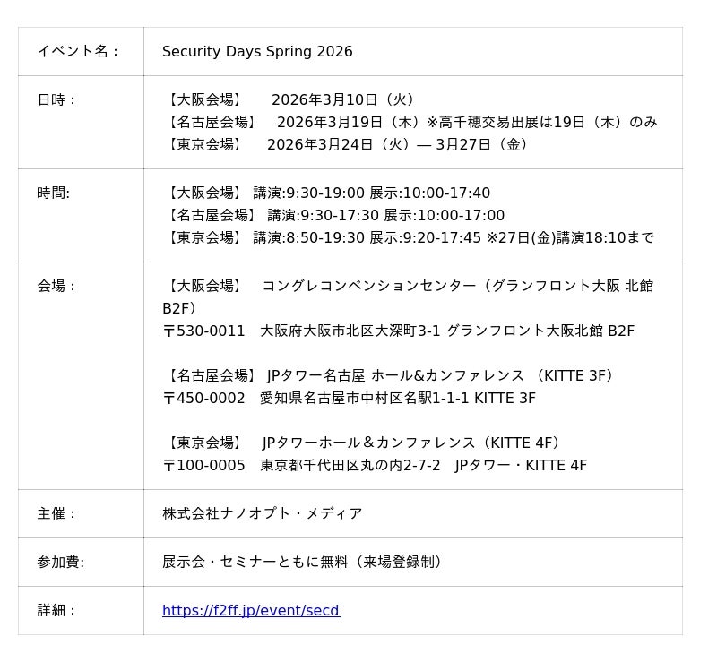 Security Daysは2026年3月に大阪・名古屋・東京・福岡の4地域で開催します。 セキュリティインシデントは減少傾向の分類もある一方、ランサムウェアのように新たな手口が次々と登場し、全体としては依然増加しています。企業・組織の対策強化で抑制される部分と、攻撃者の悪質化・巧妙化で拡大する部分が同時に存在しているのが現状です。 この不確実な状況では、最新のインシデント動向と対策を常に把握することが不可欠です。 本イベントでは、セミナーに加えて展示でも、より深い知見と実際に触れられる体験をご提供します。