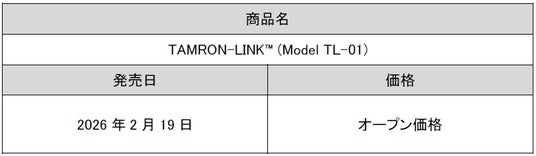 総合光学機器メーカーの株式会社タムロン(代表取締役社長:桜庭省吾、本社:さいたま市)は、動画・写真撮影をサポートするタムロン独自のアプリケーション「TAMRON Lens Utility(TM)」Mobile版の、無線通信操作を可能にするアクセサリー「TAMRON-LINK(TM) (Model TL-01)」(以下、TAMRON-LINK)を、2026年2月19日に発売します。