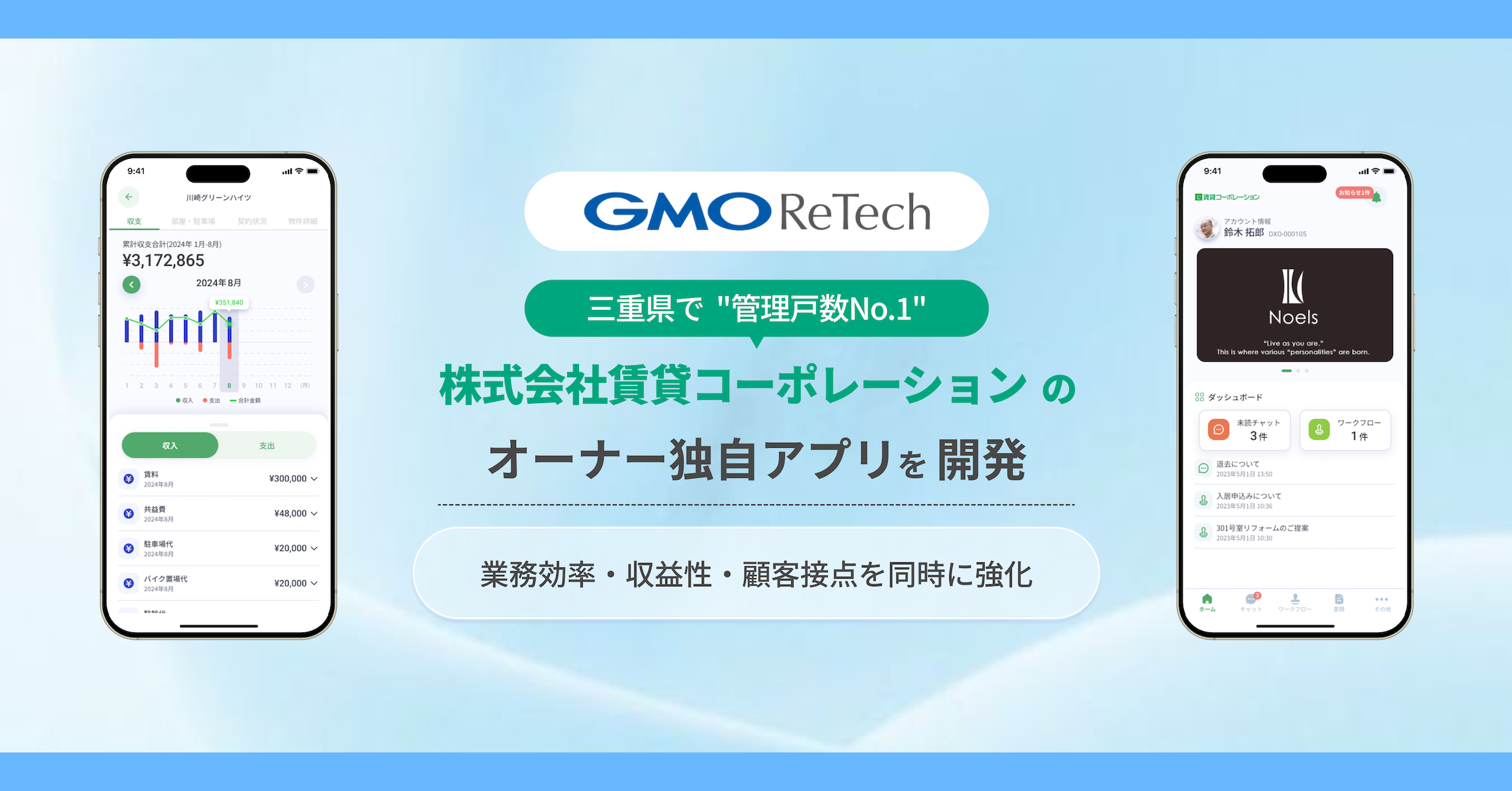 GMOインターネットグループのGMO ReTech株式会社(代表取締役社長:鈴木 明人 以下、GMO ReTech)は、三重県で管理戸数No.1を誇る(※1)株式会社賃貸コーポレーション(代表取締役:久野 尚人 以下、賃貸コーポレーション)のオーナー向けの独自アプリ「賃貸コーポレーション オーナーアプリ」を開発しました。