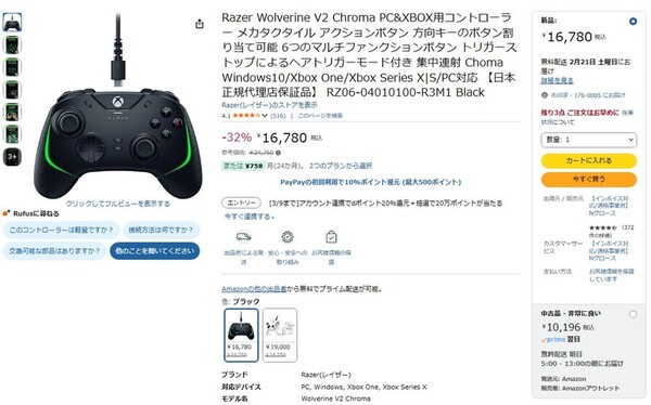 Amazon.co.jpにて、PC&Xbox用コントローラー「Razer Wolverine V2 Chroma」が販売中だ。参考価格は2万4750円だが、執筆時点では32%オフの1万6780円で購入できる(2月19日時点)。