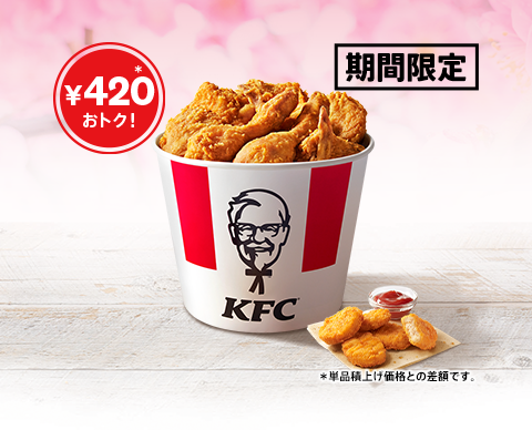 5日間限定、オリジナルチキンもナゲットもたっぷり入ったバーレルがお得です。それぞれ単品で購入するより420円もお値打ちに買えますよ。ひなまつりを祝うためでも、そうでなくても、複数人で集まった時には検討してみてはいかがでしょう。