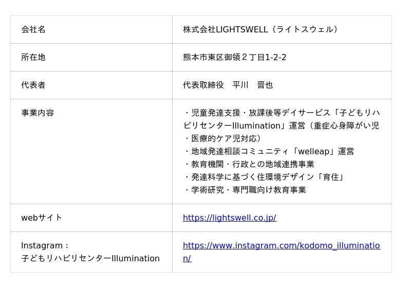 こうした課題に対し、株式会社LIGHTSWELL(ライトスウェル、本社:熊本県、代表取締役:平川晋也)は、重症心身障がい児・医療的ケア児のための療育施設「子どもリハビリセンターIllumination」の運営に加え、診断前から保護者に伴走する地域コミュニティ「welleap(ウェリープ)」の活動を通じて、子どもの発達支援における"入口から伴走する"地域インフラの構築に取り組んでいます。