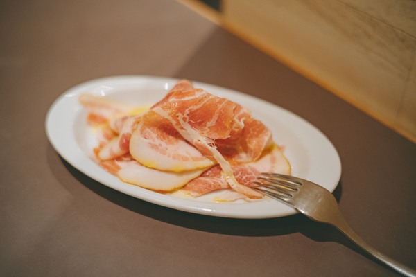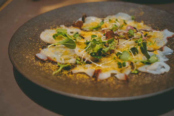 前菜には長野県産の燻製生ハム。機械ではなく職人の手で直火燻製されているため、お肉の旨みがギュッと詰まっています。お魚料理は「北海道産水タコとからすみのカルパッチョ」。ぷりぷりと甘みのある水タコに、からすみの濃厚な旨味がとろりと絡んでこちらも美味!
