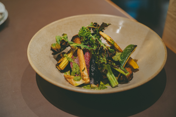 続いては「季節野菜の石窯焼き盛り合わせ」。想像より野菜の甘みがぎゅっと濃縮されていて、焼き目の香ばしさもたまらない…! 葉野菜はパリっと、かぼちゃやヤングコーンはホクホク食感で、どれを食べても美味しいんです。ニンニクとグリーンペッパー、オリーブをあわせたソースは野菜本来の旨さを邪魔せず、味わいのアクセントになっていて、3人で取り合いになるほどでした。(笑)