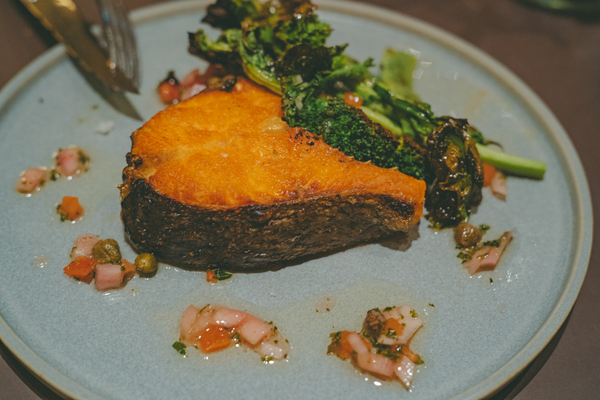 そしてメインは「骨付き信州サーモンとグリーン野菜のロースト」。分厚く切られた豪快なルックスかま食欲をそそります。石窯でじっくり火入れされたサーモンは、身がふわっとほぐれてジューシー! 皮はパリッとしていて噛むほどに脂が甘く溶け出します。ケッパーとトマト、レモンの酸味もいいアクセントで、グリーン野菜とも好相性でした。
