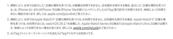 第2世代AirTagでは、このUWBの機能についても強化されており、より広い範囲で「正確な場所を見つける機能」を使えるようになったはずだったのですが、日本では規制の都合で対応できませんでした(第1世代と同等)。