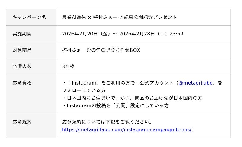 農業×新技術で持続可能な農業の実現に取り組むコミュニティ「Metagri研究所」(運営:株式会社農情人)は、茨城県の農家「樫村ふぁーむ」の生成AI活用に迫るインタビュー記事を、農家向けAIメディア「農業AI通信」にて2026年2月20日(金)より全3回にわたり公開します。記事公開を記念し、樫村ふぁーむの旬の野菜お任せBOXが当たるプレゼントキャンペーンも同時開催します。