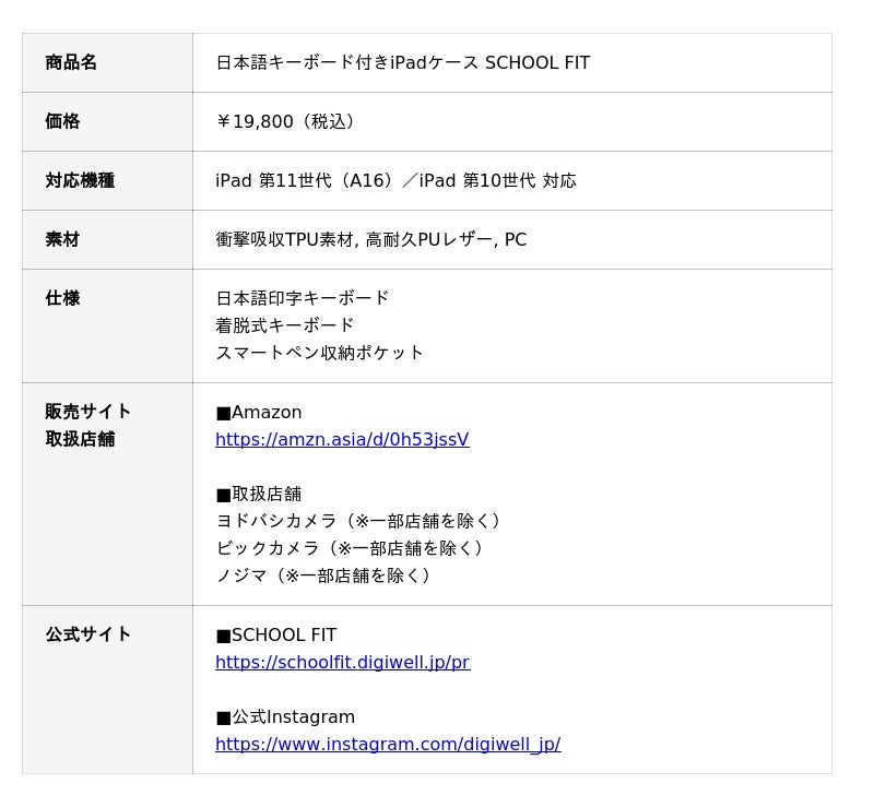株式会社KENZAN(本社:東京都杉並区、代表取締役:森山育亮)は、新ブランド Digiwell(デジウェル)より展開する学生用キーボード付きiPadケース「SCHOOL FIT」を、新学期準備シーズンに向けて1月から発売しました。本製品には、ネット依存の予防回復支援を専門とする心理師が監修した「インターネット安心ルール作りガイドブック」を付属し、家庭での話し合いとルールづくりを支援します。SCHOOL FITは、Amazonおよびヨドバシカメラ、ビックカメラ、ノジマ等の家電量販店(※一部店舗を除く)で展開しています。