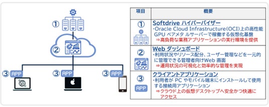 Softdriveは、Oracle Cloud Infrastructure(OCI)を基盤としたクラウド型VDIソリューションです。高性能GPUを活用し、CADやCG、AIなどの高負荷処理が必要な業務アプリケーションでも、端末や場所に依存しない快適な業務環境を提供します。建築・製造・社会インフラなど幅広い業種に展開し、3年間で40億円の売上を目指します。