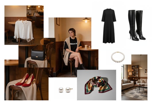 画像:AIチャットNano Banana 3に渡した女性の画像1枚と、衣装やアクセサリーなどの写真(全てAIで生成)