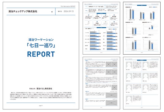 「湯治チェックアップ」により可視化された参加者様の結果は、集計・分析のうえ「健康経営レポート」として結果をお戻しいたします。お渡ししたレポートに基づき、特定の社員や部門に過度なストレスがかかっていないか等の組織診断にも応用することができ、「個別最適化された自社でのアフターフォロー」も可能となります。