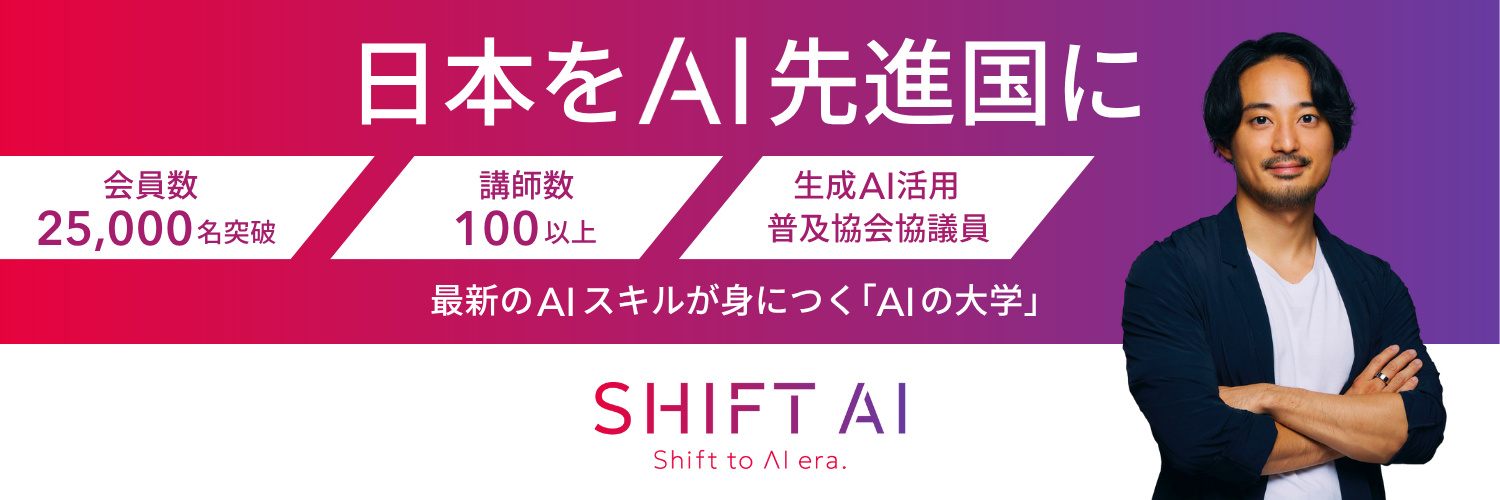 株式会社SHIFT AIは、「日本をAI先進国に」というミッションのもと、生成AIをはじめとするAI技術のビジネス活用を学べる、利用者数No.1※の生成AI学習コミュニティ「SHIFT AI」を運営しています。会員数は2万5000人を超え、法人向けのリスキリング支援サービス「SHIFT AI for Biz」や、教育機関向けの「SHIFT AI for School」など、幅広い分野でAI人材の育成を推進。さらに、独自メディア「SHIFT AI Times」の運営をはじめ、情報発信・研修・イベントを通じて、個人と組織の成長を支援し、日本全体のAI活用を加速させています。