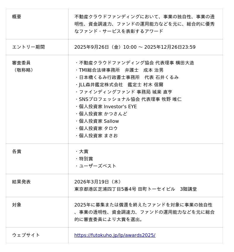 一般社団法人不動産クラウドファンディング協会(代表理事:横田 大造、以下「当協会」)は、不動産クラウドファンディングにおける、優れたファンド・サービスを表彰する「不動産クラウドファンディング・オブ・ザ・イヤー2025」(以下、「本アワード」)において、大賞の候補となるノミネートファンドを決定したことをお知らせいたします。