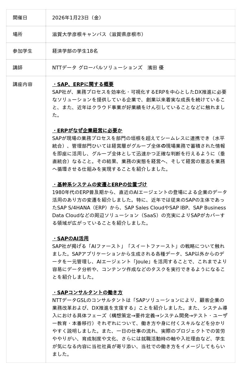 株式会社NTTデータ グローバルソリューションズ(本社:東京都中央区、代表取締役社長:木村 千彫、以下 NTTデータGSL)は、国立大学法人滋賀大学経済学部(所在地:滋賀県彦根市、学部長:能登 真規子)の学生向けに、DX推進に必要な統合基幹業務システム(ERP)・SAPの基礎を紹介する講座を2026年1月に実施しました。