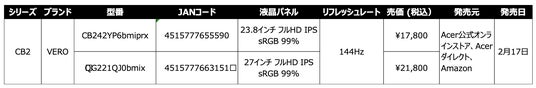 日本エイサー株式会社(本社:東京都新宿区、代表取締役社長:ボブ・セン)は、サステナブルブランド「Acer VERO」より、フルHD解像度で最大144Hzに対応した液晶モニター「CB242YP6bmiprx(23.8インチ)」「CB272P6bmiprx(27インチ)」の計2機種を、2月20日より発売いたします。両モデルはIPSパネル(非光沢)とエルゴスタンドを採用し、作業から映像視聴まで快適な表示環境を提供します。販売はAcer公式オンラインストア、Acerダイレクト、Amazonに加え、法人のお客様向けにも展開します。