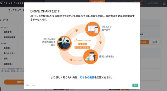 AI型次世代DAP「テックタッチ」を開発・提供し、DAP市場国内シェアNo.1のテックタッチ株式会社は、GOドライブ株式会社(本社:東京都千代田区、代表取締役社長:川上 裕幸)が提供する、契約車10万台超の次世代AIドラレコサービス『DRIVE CHART』に「テックタッチ」が採用されたことをお知らせします。ログイン後の操作ガイド表示や施策周知の効率化により、事故削減と交通安全施策の浸透を加速します。