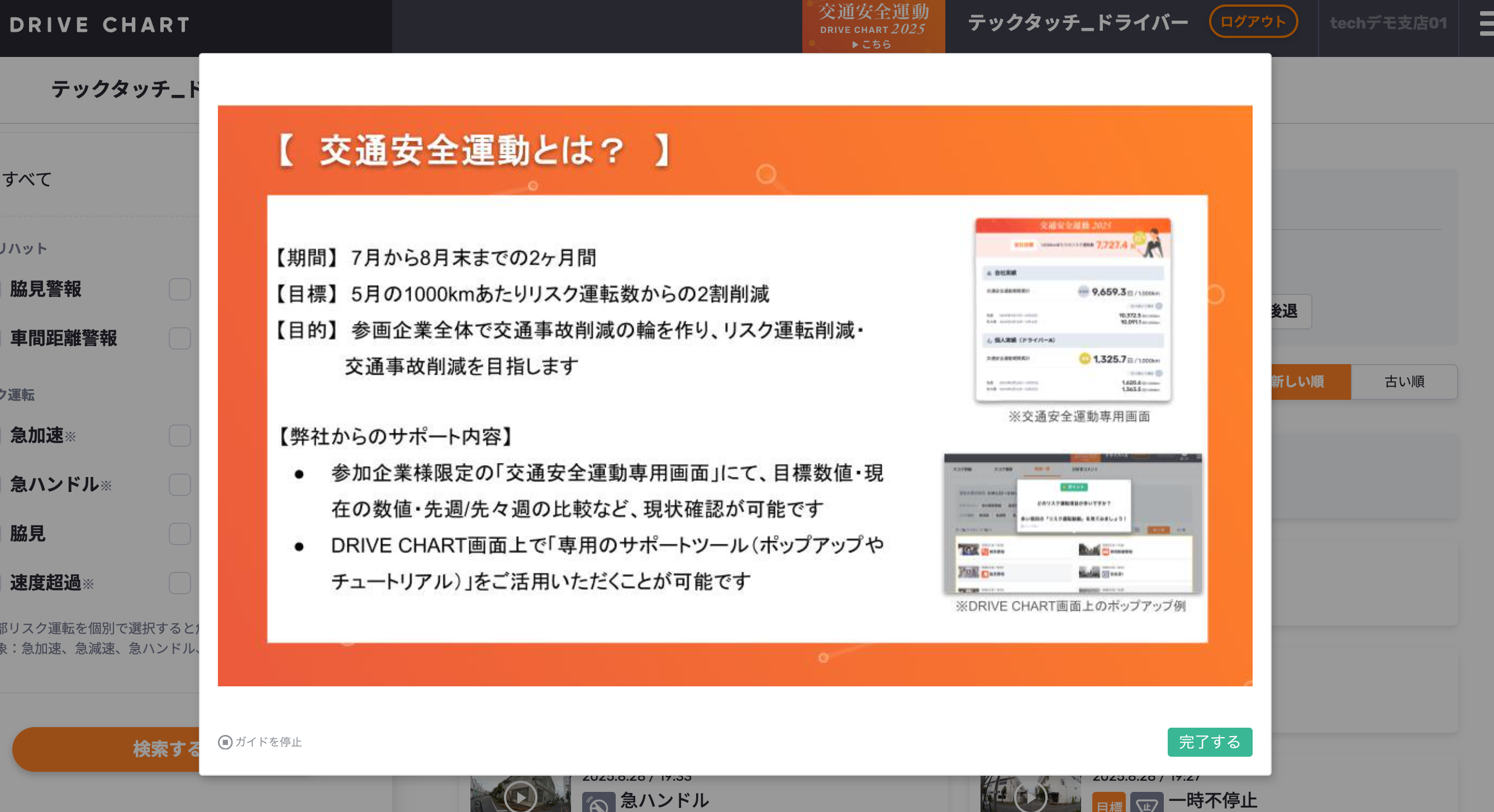 今回、エンドユーザー様に直接サービスの価値を伝える「DRIVE CHART交通安全運動」にて「テックタッチ」を導入しました。おかげさまで、参加されたお客様からは大変ご好評をいただき、サービス利用の促進に繋がり感謝しております。