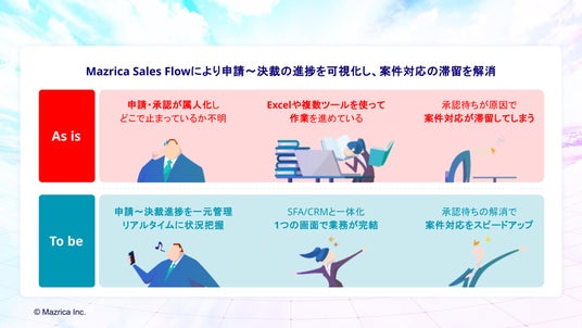 今回提供を開始した「Mazrica Sales Flow」は、その第一歩です。営業データと申請・承認・決裁プロセスを統合することで、案件進行を止めない業務基盤を構築します。