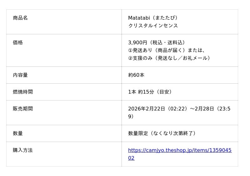 キャンプ女子株式会社(本社:福岡県福岡市、代表:橋本華恋)が展開する国産無添加お香ブランド「クリスタルインセンス」は、ANELLA CAFE 福岡大濠店との共同企画として、猫の日に合わせた限定商品「Matatabi(またたび)クリスタルインセンス」を2026年2月22日(02:22)~2月28日(23:59)の期間限定・数量限定で販売します。価格は3,900円(税込・送料込)。