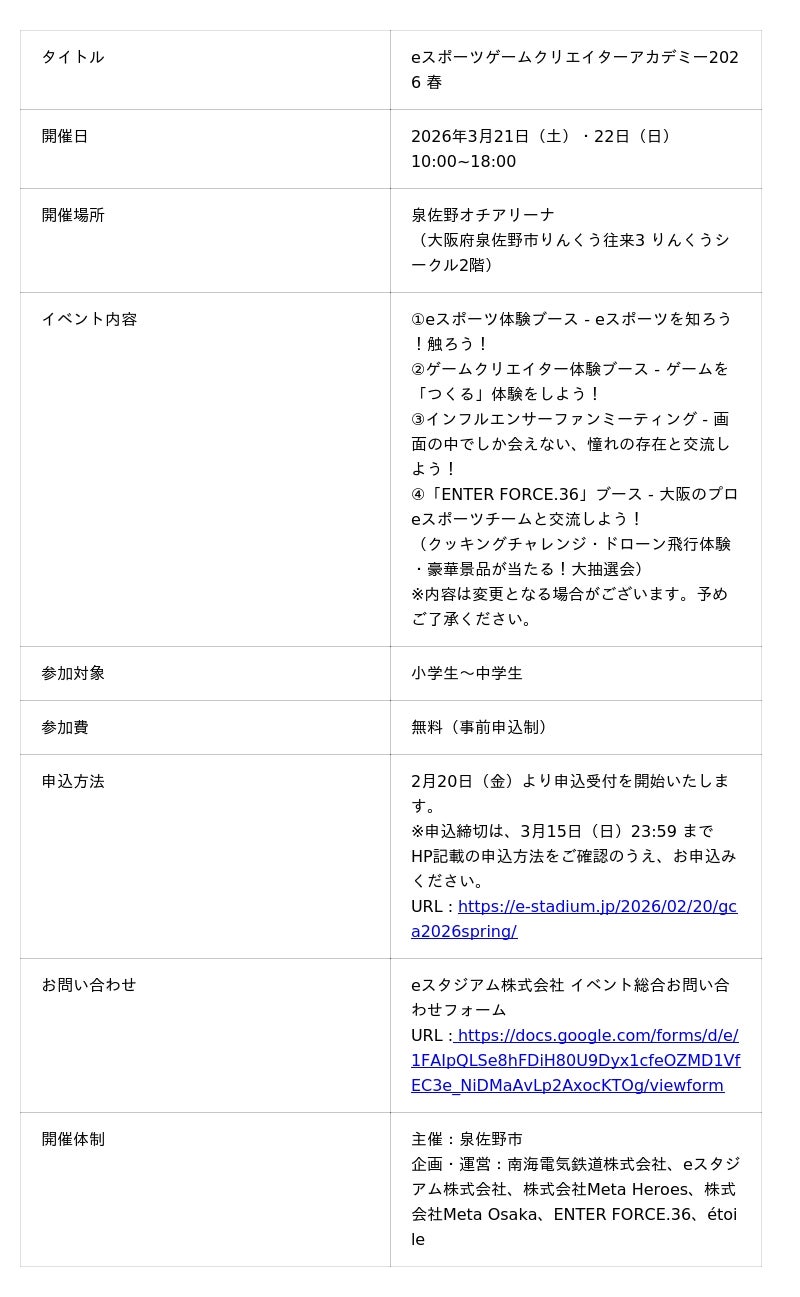 株式会社Meta Heroes(本社所在地:大阪府大阪市、代表取締役:松石和俊、以下「当社」)は、南海電気鉄道株式会社、eスタジアム株式会社、株式会社Meta Osaka、ENTER FORCE.36、etoile(エトワール) とともに、2026年3月21日(土)・22日(日)の2日間、泉佐野オチアリーナにて、職業体験型イベント「eスポーツゲームクリエイターアカデミー2026 春」(主催:泉佐野市)を開催いたします。また、本イベントへの参加申込を2月20日(金)より開始することをお知らせいたします。