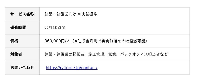 【新サービス】業務時間を80%削減!建築・建設業界に特化した「生成AI実践研修」をリリース ~最大75%の助成金活用可能・現場で“使える”伴走支援~