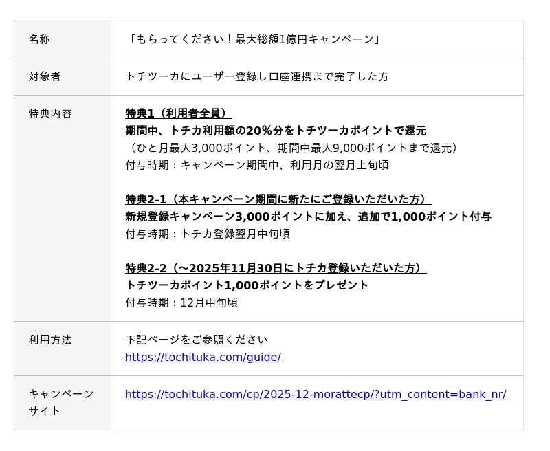 現在実施中の「もらってください!最大総額1億円キャンペーン」では、トチツーカにご登録のうえ口座連携まで完了された方を対象に、ポイント進呈を行っており、2026年2月28日(土)まで実施中です。