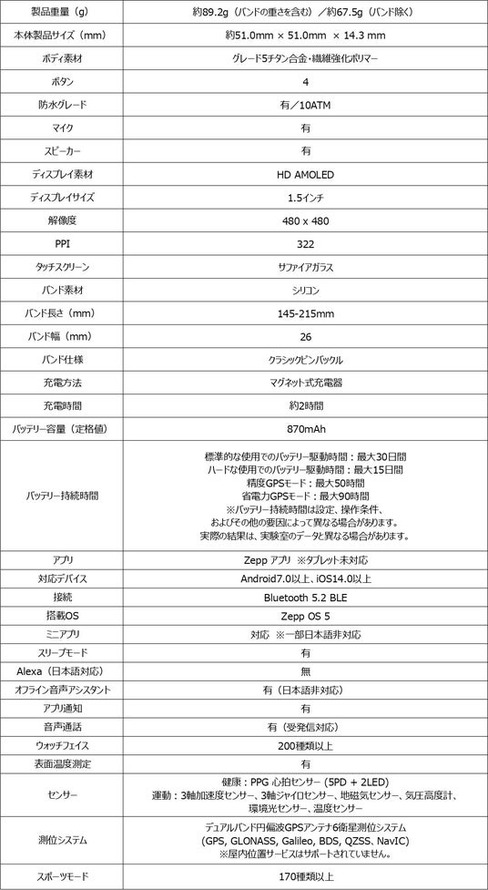 ●製品仕様について、詳しくは Amazfit 公式ウェブサイトをご覧ください。