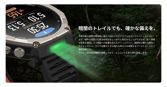 視野角を拡大した白・緑色LEDのデュアルモードフラッシュライトにより、夜間の登山やキャンプでの視認性を大幅に向上させます。