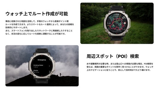 タフネスモデルのAmazfit T-Rex Ultra 2では、登山・ハイキング・クライミング・トレイルランニング・ダイビング・スキー・スノーボードなど豊富なモードを利用でき、6衛星測位システム(GPS、GLONASS、Galileo、BeiDou北斗、QZSSみちびき、NavIC)を搭載したデュアルバンドGPS(円偏波)と高度/気圧センサー、リアルタイムナビゲーションを組み合わせて累積標高やルートリターンなどのアウトドアデータを高精度に計測します。