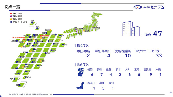 本社を福岡県福岡市、本店を長崎県佐世保市に構え、九州全域にある事務所を中心として活動する九州テンは、1967年創立の約60年の歴史を持つ企業。その核となる事業はハードウェアを中心としたプロダクト事業本部と、フィールドやシステム対応を担うシステムソリューション事業本部の2つとなる。