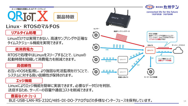エッジ側でデータ処理や制御ができるIoTゲートウェイであるQRIoT Ⅹは、単なるデータ収集にとどまらず、エッジ側での処理や制御を担うことを前提に設計されている。その大きな特徴は、リアルタイムOSとLinuxを組み合わせたマルチOS構成を採用していること。リアルタイムOS側では、高速サンプリングが必要なデータ取得や、停止させられない処理を担当する。一方でLinux側では、データの蓄積や識別、アプリケーションの実行といった柔軟性が求められる処理を行う。さらに、Linuxをスリープさせて低消費電力で動作させるといった制御も可能で、リアルタイムOSと相互に死活監視を行う仕組みも備えていると伊東氏は語る。
