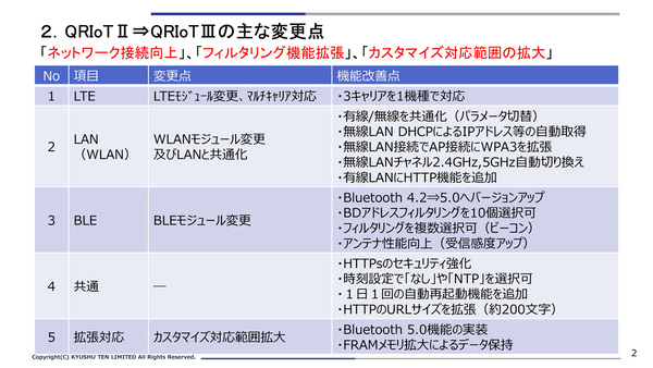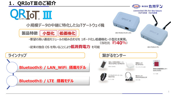 QRIoTⅢのOSはTRON系を採用している。Linuxの採用も検討されたが、サポートやメンテナンス面の負荷、協力パートナーとの関係などを踏まえ、TRON系で構築する判断に至ったという。Bluetoothからのデータ受信に特化し小型化・低価格化を実現している。長年の開発・製造実績をもとに高品質な製品に仕上げている。さらにネットワーク接続向上、フィルタリング機能拡張、カスタマイズ対応範囲の拡大などの改善を図ったQRIoT Ⅲは3月24日に販売が開始された。現行機のQRIoT Ⅱは3月31日を持ってQRIoT Ⅲへ移行され、在庫がなくなり次第に販売終了となる。