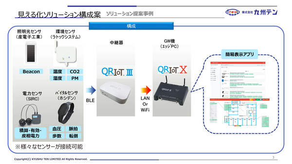 九州テンは、まずデータを集めて試したいという顧客に対し、簡易表示アプリやローカルで完結する構成を提示し、必要に応じてクラウド連携や上位システム連携へと発展させることを提案する。そこでQRIoT Ⅲを分散配置して広域にデータを収集し、リアルタイム処理やアプリケーション実行を担うQRIoT Ⅹと組み合わせることで、段階的な拡張が可能だ。その上で、一定のボリュームが見込める顧客には、個別要件に応じた通信機器やハードウェアそのものの設計にも対応している。