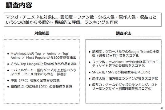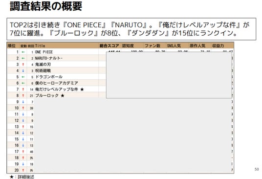 個別IP調査のサマリー:マンガ・アニメIPを対象に、認知度・ファン数・SNS人気・原作人気・収益力という5つの軸から多面的・機械的に評価、ランキングを作成しました。それぞれの数値を反映させて、トップ20の総合ランキングを算出しています。