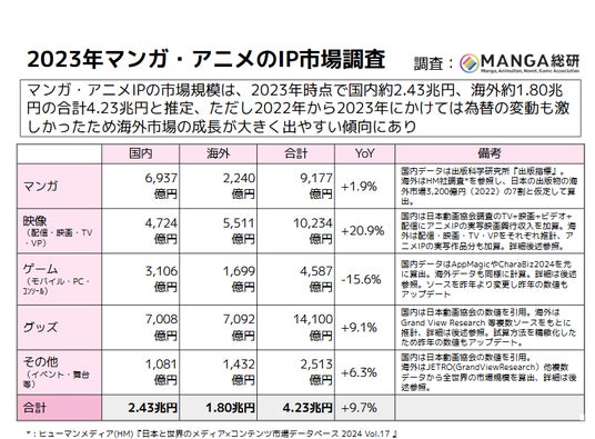 マンガIPはゲーム・グッズ・ライブエンターテイメントなど多岐にわたって展開されています。一般社団法人MANGA総合研究所(以下:MANGA総研)は、2025年より、これらの様々な情報を統合・試算する「IP市場調査」を実施しています。昨年度のレポートでは、マンガ原作アニメの国内外収益、ゲーム・グッズ化による市場規模、『ONE PIECE』や『呪術廻戦』などの個別IPの経済効果などをリサーチ結果として初めて公開しました。昨年の詳細はこちら( https://prtimes.jp/main/html/rd/p/000000005.000145029.html )をご覧ください。