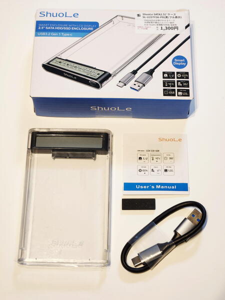 製品の正式名称は「ShuoLe 2.5" SATA HDD/SSD ENCLOSURE」。パッケージを開けると、クリアな本体のほかにUSB 3.2 Gen 1 Type-Cケーブル、そして多言語対応の簡素なマニュアルが同梱されている。基板を露出させたメカニカルなデザインは、かつてのスケルトンブームを彷彿とさせ、40代以上の世代にはたまらないノスタルジーを感じさせる。