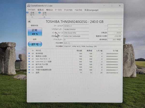 「このエンクロージャ、少々おめでたい判定を下すのではないか?」。そう感じた筆者は、知人から「かなり数値が悪い」とされる東芝製の240GB SSDを借り受けてきた。PCで確認したところ、健康状態は「49%」。寿命を半分使い果たした、まさに「満身創痍」風の個体である。