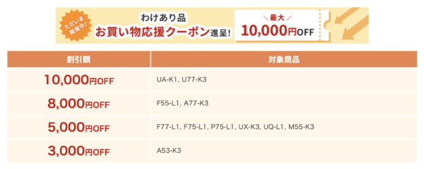 さらに現在は、サイト上で適用できる「わけあり品お買い物応援クーポン」を使用することで、追加で1万円の値引きを受けることが可能だ。