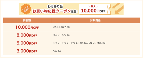 現在、出荷準備中や手配中にキャンセルとなった未使用・未開封品をラインアップする「わけあり品」コーナーでは、各モデルが特別価格を販売しており、さらに価格が最大で1万円オフになる「わけあり品 お買い物応援クーポン」を配布中だ。