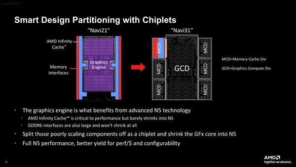 Navi31場合、GPUのコアそのもの(GCD)は5nmで、インフィニティ・キャッシュ+メモリーコントローラー(MCD)は6nmにすることで、全部5nmで製造するよりも歩留まりを引き上げ、原価を下げている