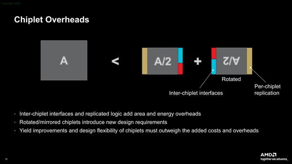 もちろんメリットだけではなくデメリットもある。まずは物理的に、チップレット構成にすることでダイが大型化する。要するに2つのチップレットを接続するためのPHYや、場合によってはコントローラーも追加する必要がある。またチップレット同士をどう接続するかも問題である。
