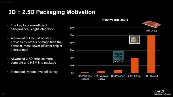 Off-Package Copperというのは、例えば昔のCPUとチップセットの間がDMIでつながっているような構成であり、これをOn-Packageにするだけで5倍ほど効率があがる。これをシリコン・インターポーザーにすることで20倍ほどになり、3D積層では60倍まで効率が向上する。